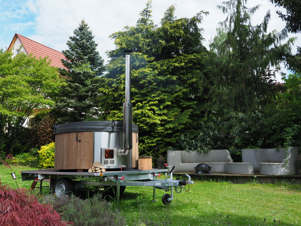 Einen bestellten Hot Tub ausgeliefert. Mit Integriertem Edelstahlofen, grauer Wanne und Thermoabdeckung.